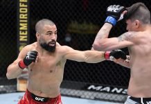 Note the number of times the word “missed” came up there. The crowd was not loving it. Makdessi came out and took center in the second; he started to press the action as he stalked Pinedo around the cage. Pinedo landed a body kick but Makdessi kept moving forward. Makdessi continued to land leg kicks on the lead leg of Pinedo. Makdessi fired off a head kick that was blocked by Pinedo. Pinedo fired off another pair of a kicks that were blocked. Makdessi answered with a high kick of his own. Pinedo returned with a left hook followed by a right. Makdessi continued to chop at the visibly damaged lead leg of Pinedo. They exchanged again with Pinedo landing a head kick to close out the round.