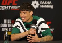 Fiziev fanned on a spinning kick early in the second, but followed it up with a hard right hand. White changed levels, timing the shot well, but with his back to the fence, Fiziev was able to fight the attempt off. He began bullying White, backing him up, and attacking the body. White’s hands were low, his mouth was open, and he was showing some damage by the eye. White would again shoot for a takedown, only for Fiziev to show impressive balance in fighting the attempt off. Fiziev would land to the head with a kick, which was at least partially blocked. At the end of the frame, White was still engaging, but he was well behind.