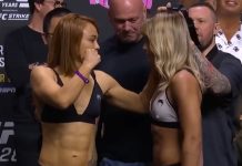 Thirty seconds into the third and Pinheiro blitzed Hughes and landed a couple of punches. 3:18 left in the fight, and the referee told the pair of fighters to fight. Calf kick from Hughes with two minutes left, and she ate a right hook. Hughes put Pinheiro against the fence and landed an elbow. Pinheiro worked off the cage and escaped to the center. Hughes threw a flying knee, but nothing landed and then landed a body kick. The fight ended with another flying knee attempt and hook from Hughes.