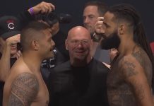 Not so fast. Earning the dubious distinction of becoming the first heavyweight to ever miss weight for a UFC fight, Justin Tafa came in at 267lbs for his fight with Harry Hunsucker. Previously, Greg Hardy had come in heavy on an initial attempt, but was able to make weight after being granted extra time to complete his cut.