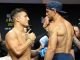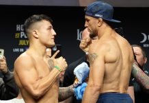 When they tied up along the fence, it was Torres pressing Dern up against the cage. Nothing would come of that, with the pair breaking and returning to center. Through the first half of the round, the action played out entirely on the feet; Torres would attack the lead leg of Dern, risking a takedown but getting away with it for the time being.