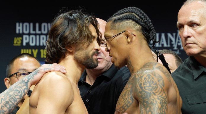 Torres, however, stayed on top, stacking her opponent up, and Dern immediately moved to the next submission, looking for a triangle or arm-bar. With two minutes remaining in the round, the second was as much in Dern’s world as the first round has been in Torres’s. Dern transitioned from the arm to a leg, looking for a knee bar. Torres rolled, holding on to Dern, who then began wrenching on the foot. She added some backfists, but Torres made it out of the round.