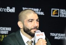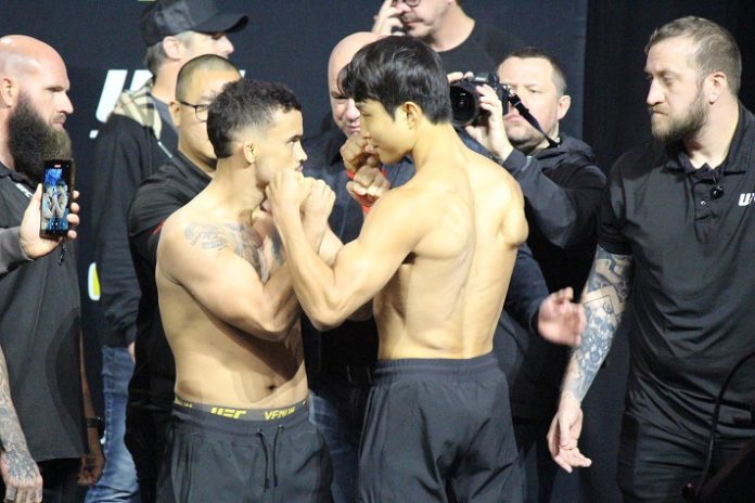 Round 1 Santos came out on fire with combinations and going for the head. Lee was able to weather the early storm and land kicks to the body. A big right hand sent the Brazilian to the canvas, but he popped up quickly and forced Lee to the fence as he looked for the takedown.