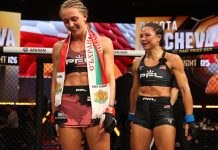 Anderson, coming into the event with pal Ben Askren undergoing a double lung transplant, made his heavyweight debut for the promotion in a fight against PFL Global heavyweight champion Denis Goltsov. Anderson, still the reigning Bellator MMA light heavyweight champion (announced as such), didn’t give up much in height or weight, already a massive 205’er who had fought at heavyweight early in his career. That might have been key, as “Overtime” was able to hold his own against the veteran heavyweight, controlling the action up against the cage.