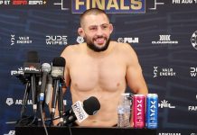 In the first round of the PFL Atlantic City co-main event on Friday, Pinedo came out pressing the action, but was quickly taken down by Khaybulaev in the middle of the cage. Movlid sat in top position from full guard, landing short punches to the head of Pinedo. The referee unspeakably stood the fighters up and Pinedo came forward like he was shot out of a cannon. Both fighters stayed in the pocket and threw bombs, tagging each other repeatedly before Khaybulaev landed a takedown. Once on the ground Movlid remained in control until the end of the round landing quality ground and pound on top.