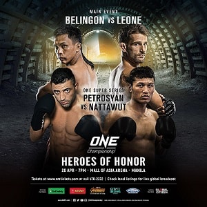 ONE Championship: Heroes of Honor Byadmincsp -March 31, 2018 Share on Facebook Tweet on Twitter Date: April 20, 2018Location: Manila, PhilippinesMore info