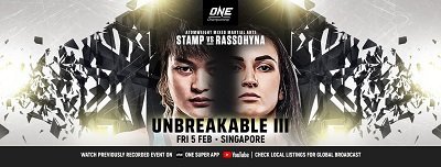 ONE Championship: Unbreakable III Byadmincsp -February 2, 2021 Share on Facebook Tweet on Twitter Date: February 5, 2021Location: Kallang, SingaporeMore info