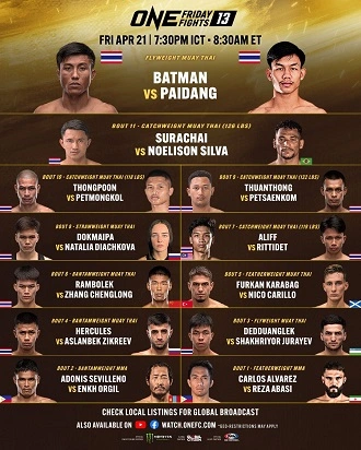 ONE Friday Fights 13 Byadmincsp -April 19, 2023 Share on Facebook Tweet on Twitter Date: April 21, 2023Location: Bangkok. Thailand