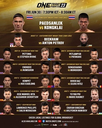 ONE Friday Fights 23 Byadmincsp -June 30, 2023 Share on Facebook Tweet on Twitter Date: June 30, 2023Location: Bangkok, Thailand