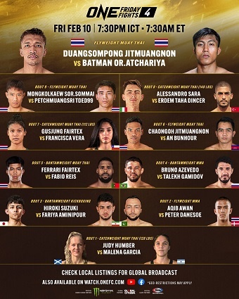 ONE Friday Fights 4 Byadmincsp -February 8, 2023 Share on Facebook Tweet on Twitter Date: February 10, 2023Location: Bangkok, Thailand