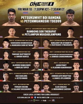 ONE Friday Fights 8 Byadmincsp -March 9, 2023 Share on Facebook Tweet on Twitter Date: March 10, 2023Location: Bangkok, Thailand