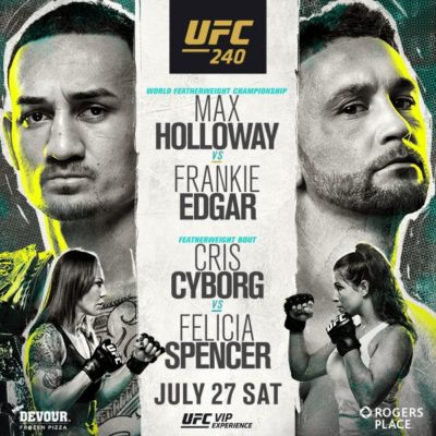 UFC 240 Byadmincsp -July 2, 2019 Share on Facebook Tweet on Twitter Credit: UFC Date: July 27, 2019Location: Edmonton, ABMore info